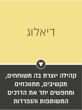 - דיאלוג בין אנשים לקהילות: מתן כלים ויצירת מנגנונים לקיום דיאלוג מתמיד, מתוך כבוד לדמיון ולשונות והכרה בהם.
